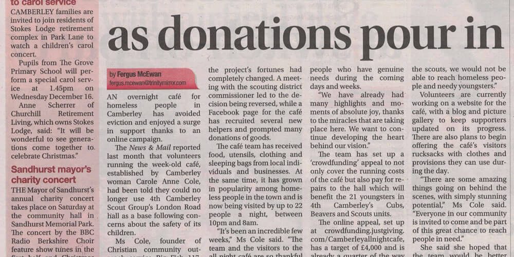 We are delighted to see that we have been featured in this weeks Camberley News and Mail newspaper. Here you will see the article that has been written about the Camberley All Night Café 🙂